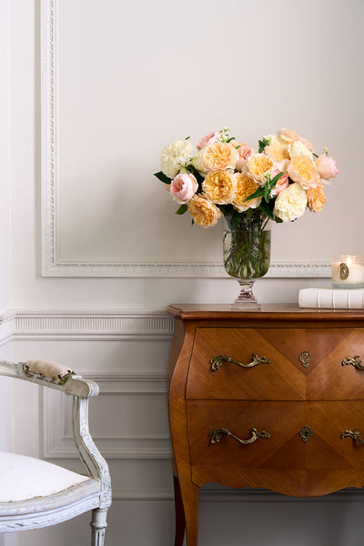 From Juliet’s mellow peach tones to Beatrice’s golden yellow, the Sorbet Shades bouquet is an uplifting display of softly spoken and understated English Rose elegance. Joyful to look at thanks to the additional sunshine shades of Effie but balanced by Leonora’s ivory accents, these four roses together form something sophisticated, a touch zesty and full of powdered prettiness. Expect a scent medley of myrrh, honey and nougat from Beatrice rounded by Effie’s black tea and violet with notes of apricot running through both.